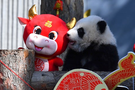 “Newborn baby pandas from the class of 2020 ... wish you a happy New Year and lots of good luck in the Year of the Ox,” their keepers shouted with the pandas in their arms, while some tried to clamber away.