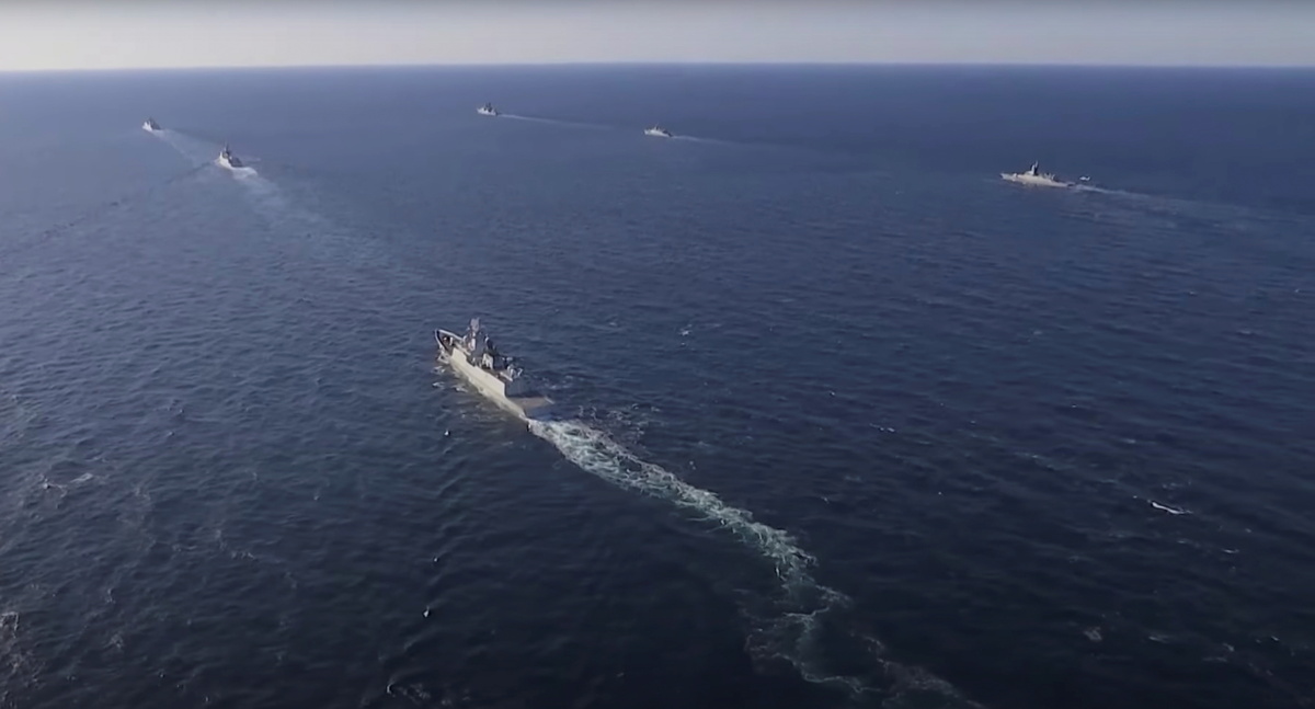 A group of naval vessels from China and Russia sails during joint military drills in the Sea of Japan, in this still image taken from video released on October 18, 2021. Video released October 18, 2021. Russian Defence Ministry/Handout via REUTERS ATTENTION EDITORS - THIS IMAGE WAS PROVIDED BY A THIRD PARTY. NO RESALES. NO ARCHIVES. MANDATORY CREDIT.