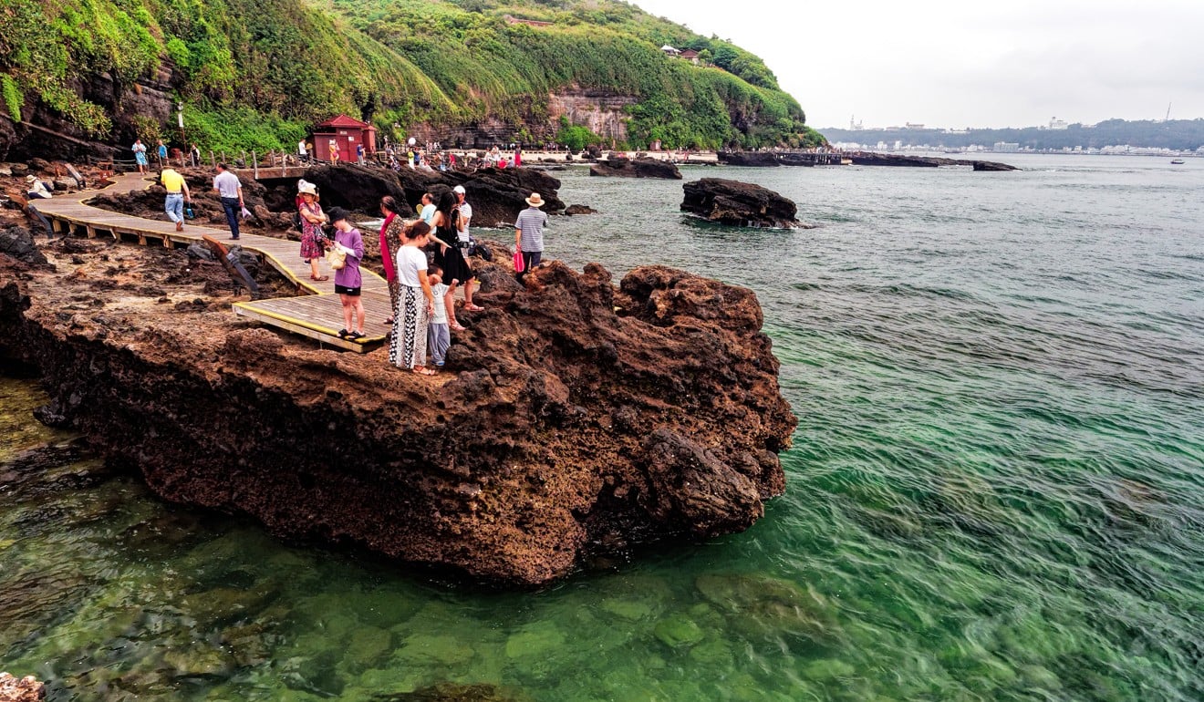 Weizhou's days of major eruptions are long past, and the recent seismic activity it has seen has been confined to localised blasts of ash and lava bombs. Still, I'm glad the volcano remains dormant as we walk the coastal pathway, admiring the shoreline of rock hewn into features such as a natural bridge and a rocky protrusion in a small cave that somewhat resembles a turtle.