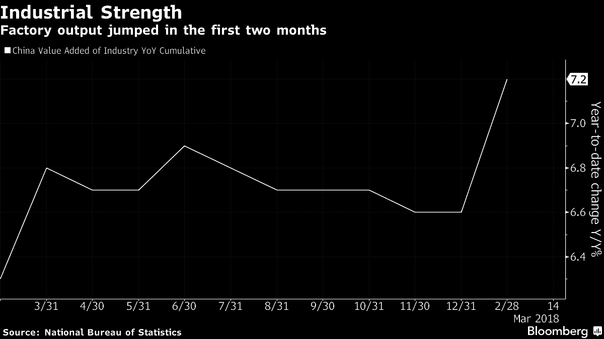 Factory output and investment in fixed assets exceeded economists’ expectations in the first two months of this year, climbing 7.2 percent and 7.9 percent respectively from a year earlier as Chinese exports surged. Retail sales also remained robust, statistics bureau data -- combined for January and February to smooth effects from the Lunar New Year holiday -- showed on Wednesday.