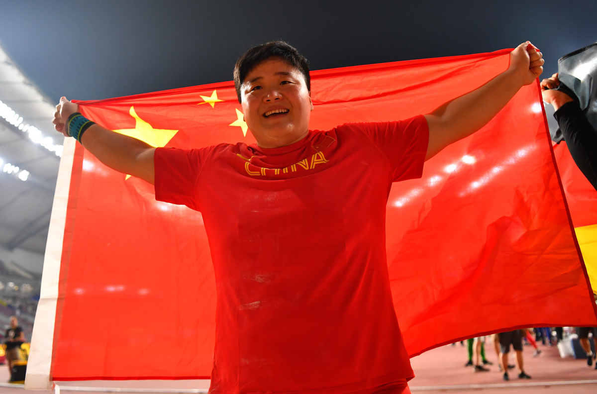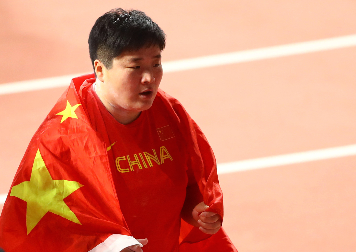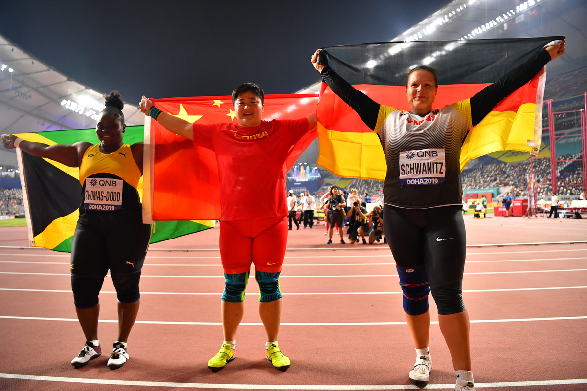 Athletics - World Athletics Championships - Doha 2019 - Women's Shot Put Final - Khalifa International Stadium, Doha, Qatar - October 3, 2019 China's Lijiao Gong in action REUTERS/Kai PfaffenbachAthletics - World Athletics Championships - Doha 2019 - Women's Shot Put Final - Khalifa International Stadium, Doha, Qatar - October 3, 2019 Gold medalist China's Lijiao Gong, silver medalist Jamaica's Danniel Thomas-Dodd and bronze medalist Germany's Christina Schwanitz pose REUTERS/Dylan MartinezAthletics - World Athletics Championships - Doha 2019 - Women's Shot Put Final - Khalifa International Stadium, Doha, Qatar - October 3, 2019. Lijiao Gong celebrates. REUTERS/Ahmed Jadallah