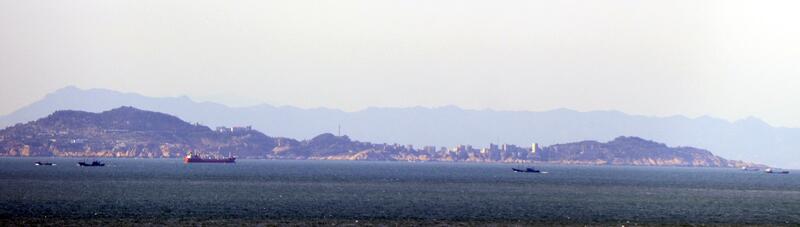 Looking west over the glimmering sea, skyscrapers and wind turbines in China's southeastern province of Fujian were seen about 10 kilometers away from the shores of the Matsu Islands, which is dotted with Taiwan military defense posts.