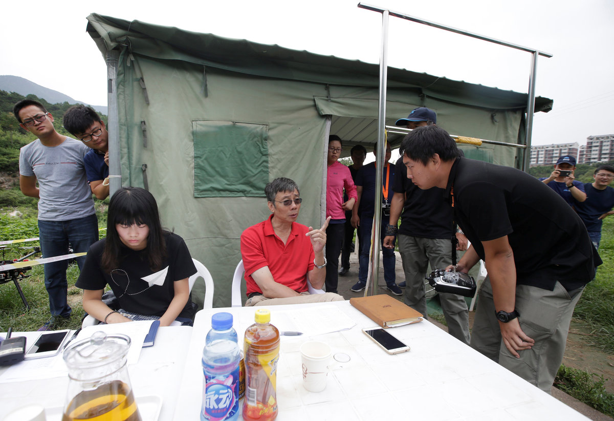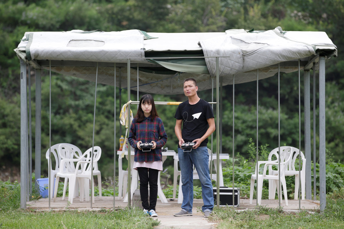 A trainee flies a drone next to a China Civil UAS (Unmanned Aerospace Surveillance) Pilot Flight examiner (in red) during his examination for the license from AOPA CHINA (Aircraft Owners and Pilots Association) at LTFY drone training school on the outskirts of Beijing, China August 14, 2017. REUTERS/Jason Lee