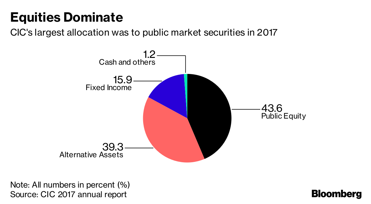 Public equities fell to 43.6 percent of CIC’s overseas portfolio as of Dec. 31, from 45.9 percent a year earlier, according to the annual report. Alternative investments, which include real estate and hedge funds, rose to 39.3 percent from 37.2 percent.