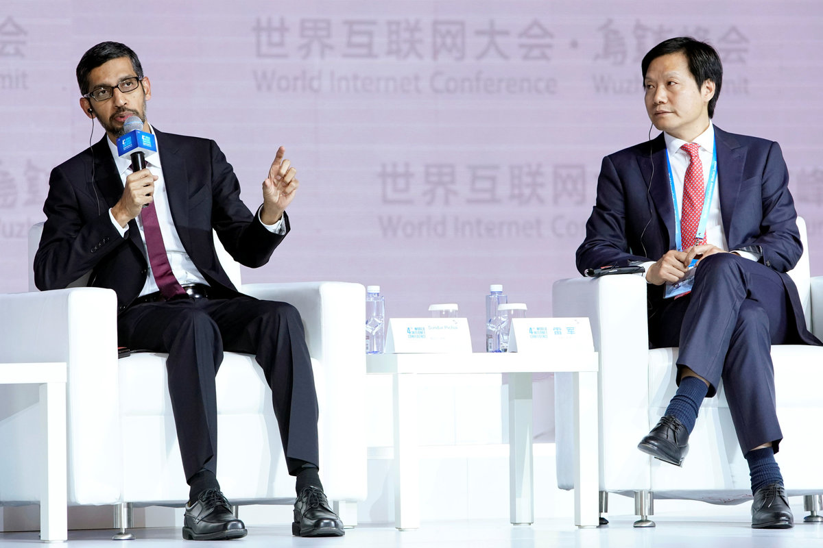 Google Inc. CEO Sundar Pichai (L) and Xiaomi's founder and CEO Lei Jun attend a session of the fourth World Internet Conference in Wuzhen, Zhejiang province, China, December 3, 2017. REUTERS/Aly Song