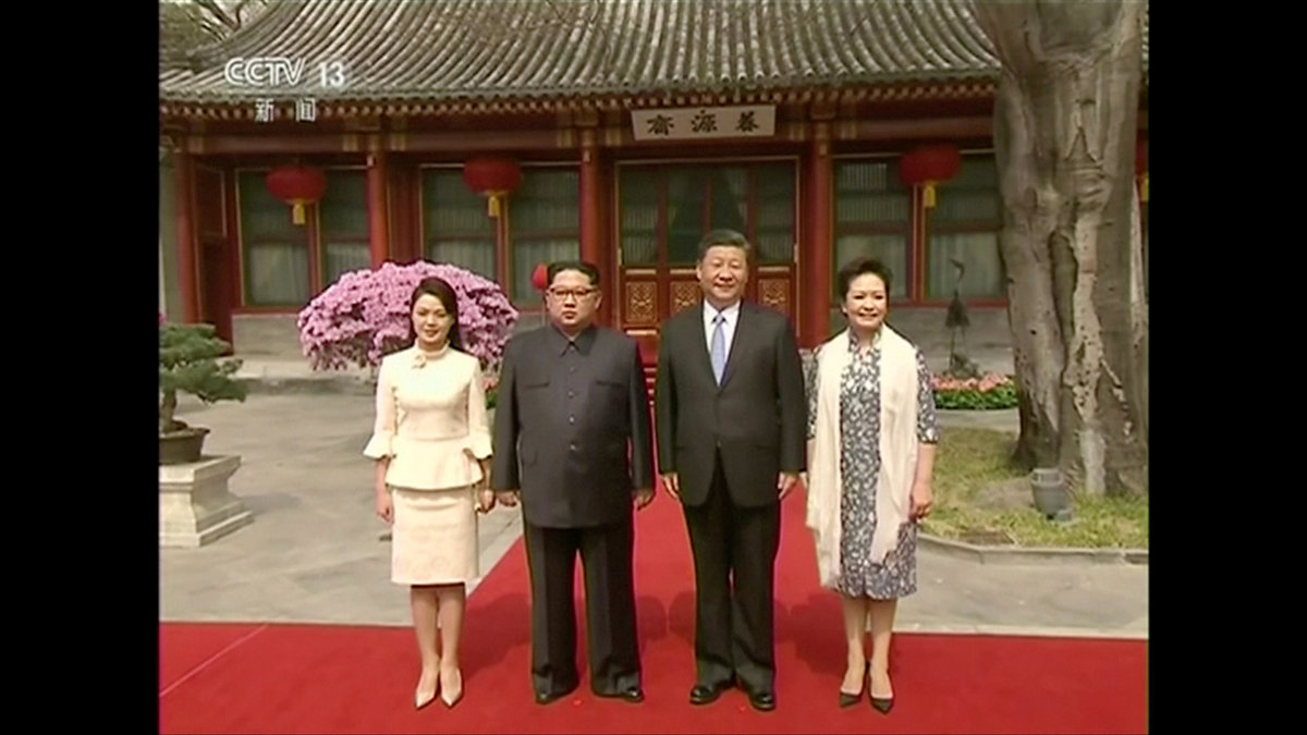 State television showed pictures of the two men chatting and Kim's wife, Ri Sol Ju, getting a warm welcome from Xi's wife, Peng Liyuan.