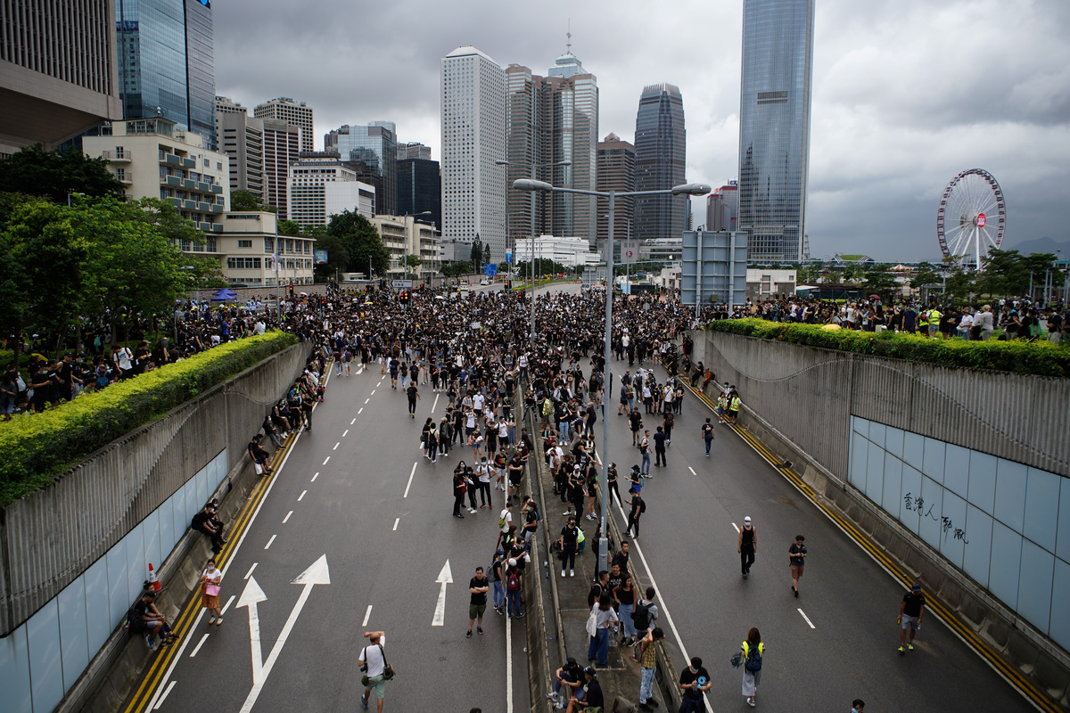 On Monday, protesters near the government's offices blocked roads and urged Lam to withdraw the bill, release arrested students, drop the official description of a rally on Wednesday that involved clashes with the police as a riot, and step down.