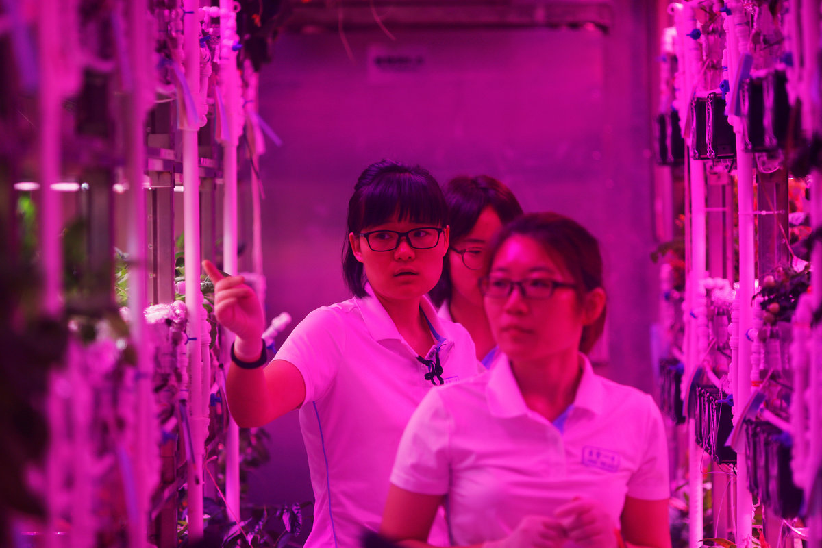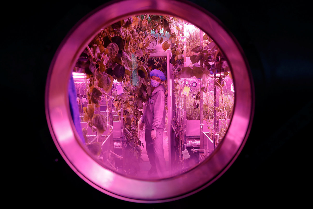 A volunteer checks on plants inside a simulated space cabin in which he temporarily lives with others as a part of the scientistic Lunar Palace 365 Project, at Beihang University in Beijing, China July 9, 2017. REUTERS/Damir Sagolj
