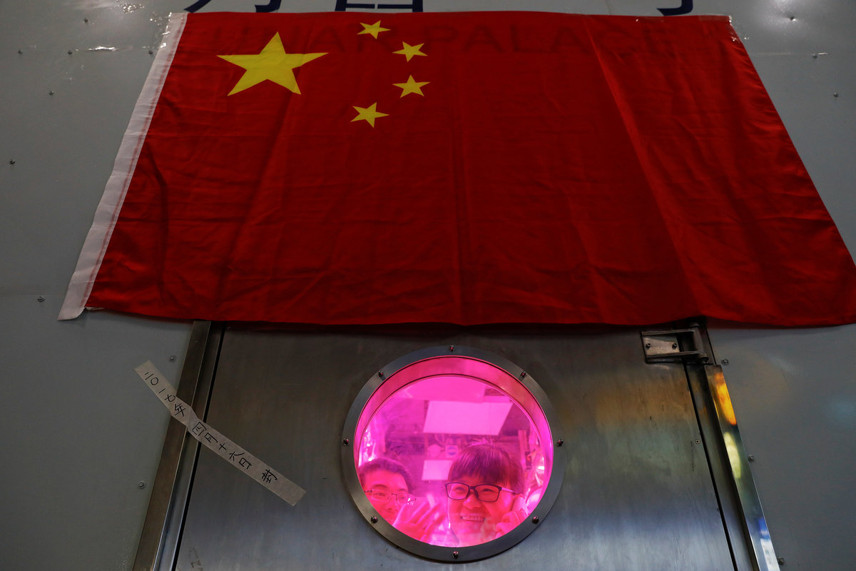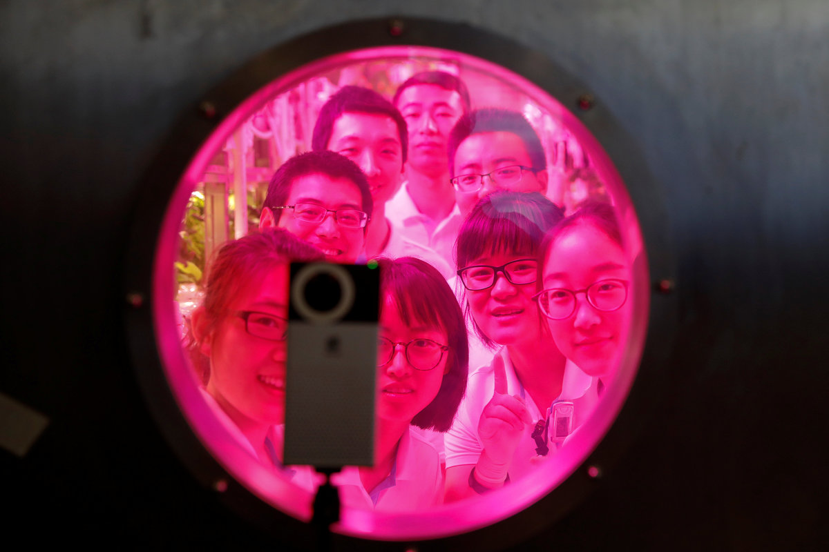 Volunteers smile from inside a simulated space cabin in which they temporarily live as a part of the scientistic Lunar Palace 365 Project, at Beihang University in Beijing, China July 9, 2017. REUTERS/Damir Sagolj