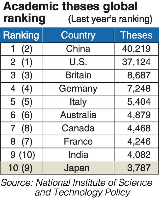 Tenth-placed Japan, with 3,787 theses, continues its climb down the table since it ranked fifth 10 years ago.