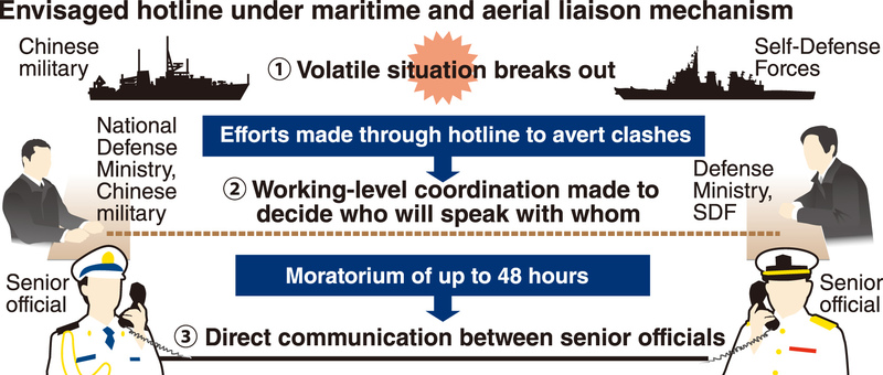 The hotline is the core of a maritime and aerial liaison mechanism agreed to between the Japanese and Chinese leaders to avert collisions. The Japanese and Chinese governments have not revealed the details of the agreement, but besides the hotline, they have agreed to set rules for direct communications between their vessels and aircraft in the field. Other agreements include having Japanese and Chinese defense authorities hold regular meetings.