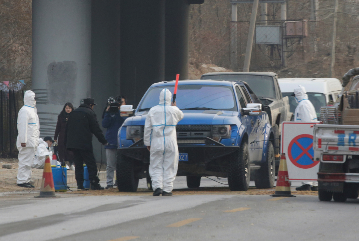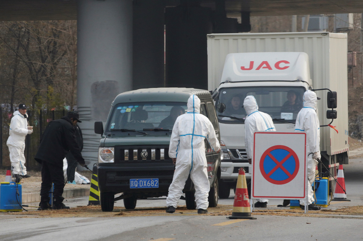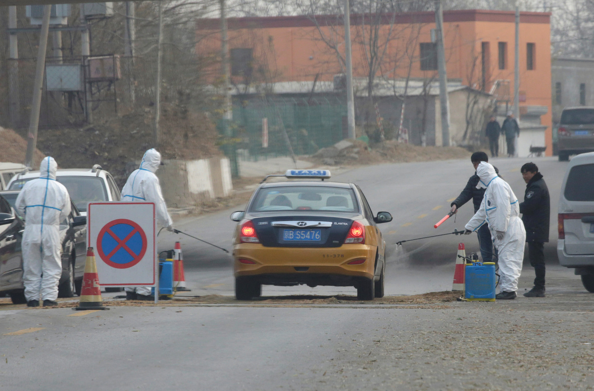 At a checkpoint outside of Guogezhuang village in the Fangshan district on Friday, workers in white suits sprayed cars with disinfectant. A Reuters journalist was stopped at the checkpoint and barred from reaching one of the affected farms.