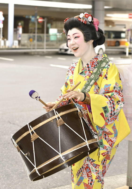 Chindonya ding-dong bands are enjoying a revival. Chindonya members clad in flamboyant costumes parade through the streets, advertising restaurant openings and announcing events by banging on drums and playing other musical instruments.