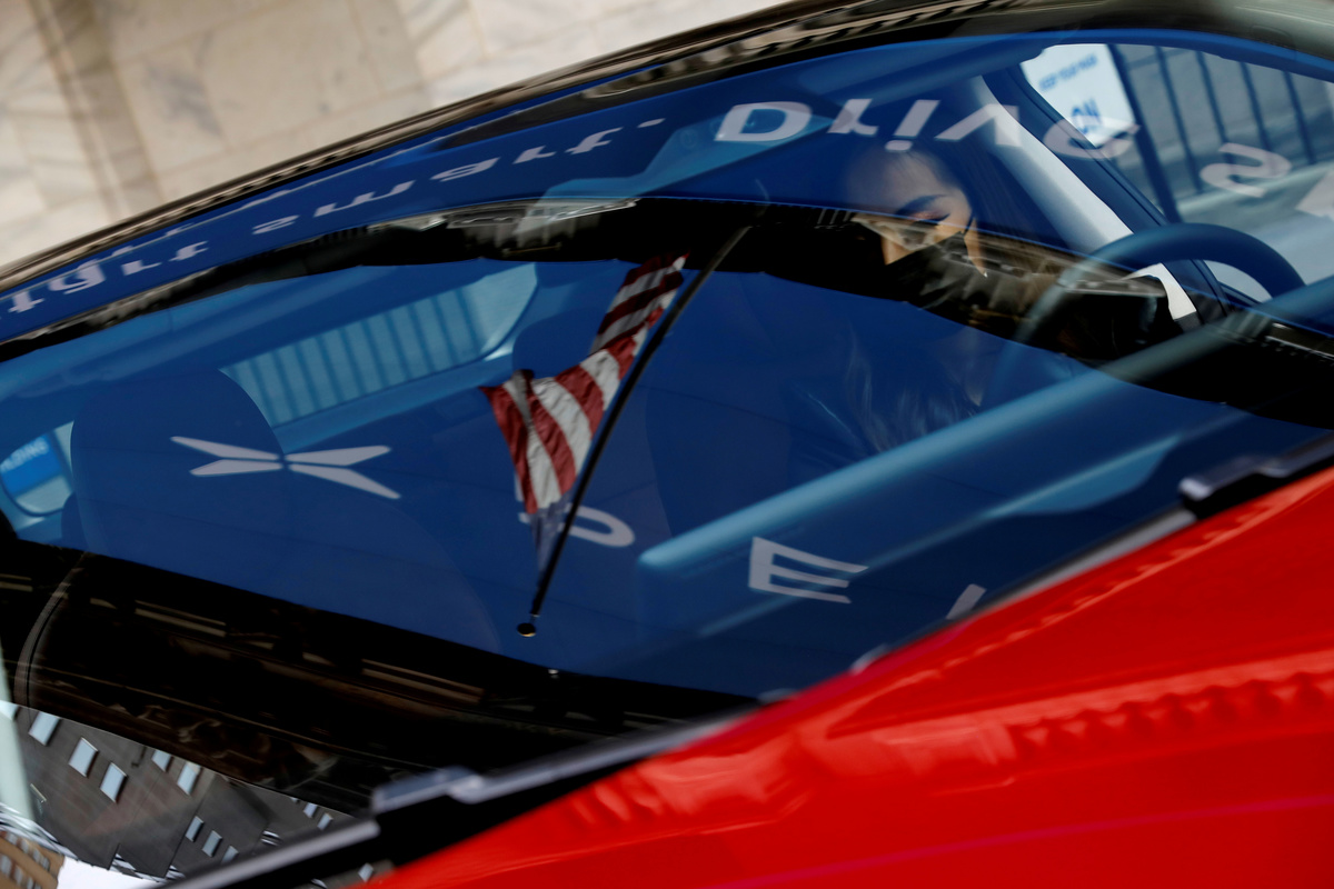 A woman sits inside an XPeng Inc. P7 performance electric vehicle outside the New York Stock Exchange (NYSE) ahead of the Chinese company's IPO trading under the stock symbol "XPEV" in New York, U.S., August 27, 2020. REUTERS/Mike Segar