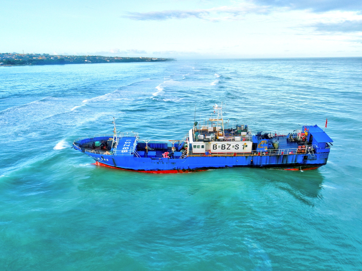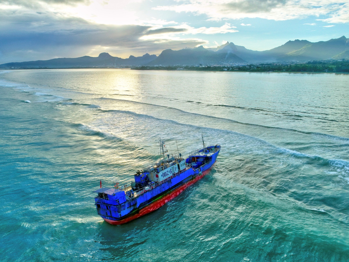 Drone footage showed dark patches in the Indian Ocean waters near the "Lu Rong Yuan Yu 588" after it ran aground on Sunday.