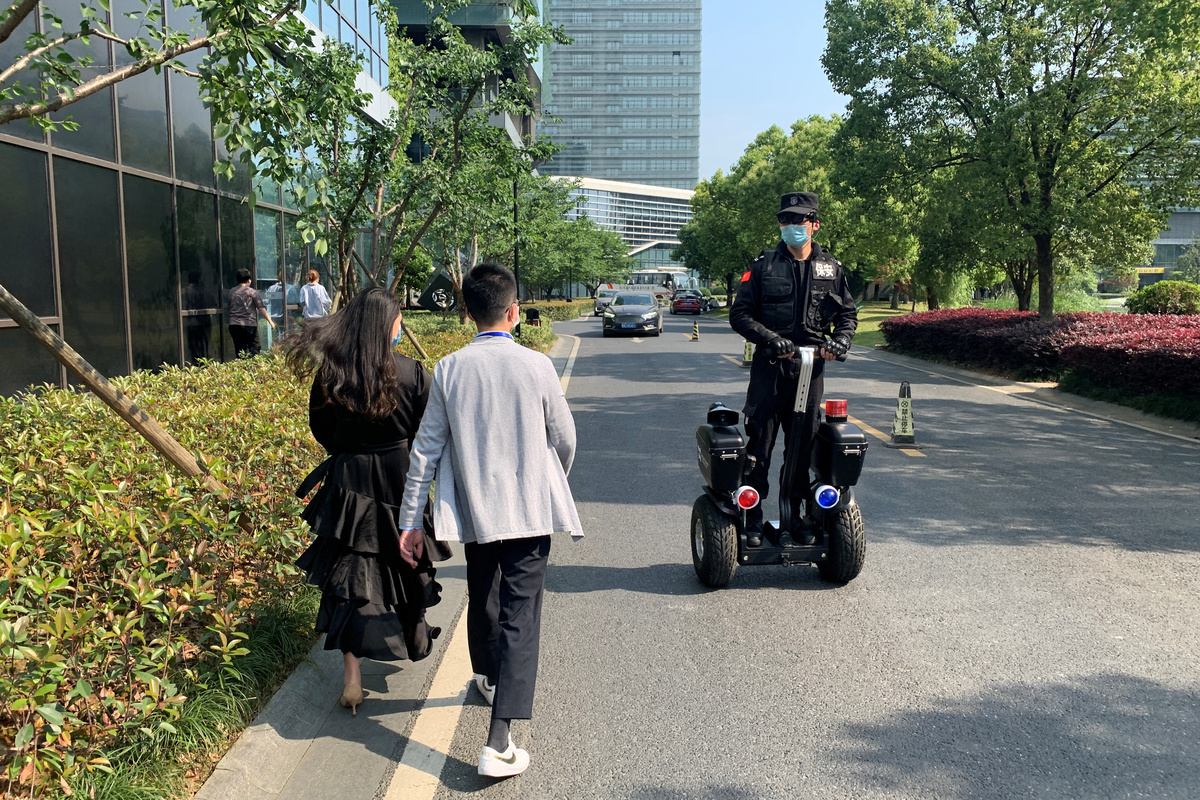One office park in Hangzhou is replacing fixed thermometer stands with glasses after a flood of employees returning to work made temperature checks a headache for property management.