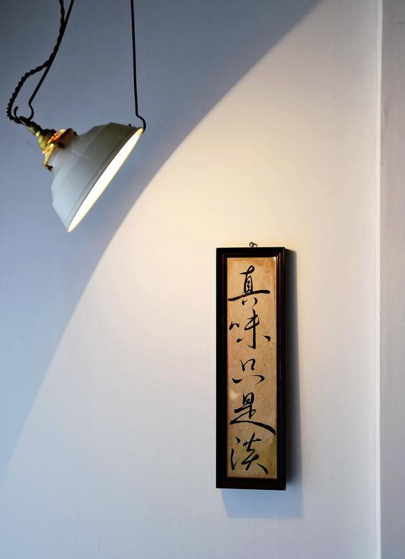 White walls and antique furniture, including large cupboards for which he created room by knocking out part of the wall, give the space an intimate atmosphere that is complemented by a framed piece of calligraphy by his wife, bearing a line from Ming Dynasty scholar Hong Zicheng's Caigentan: "The true flavor of food is plain."
