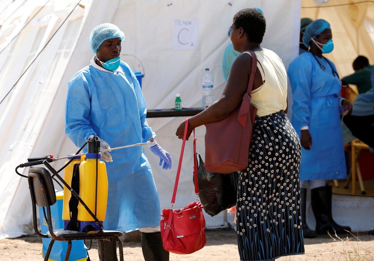 Medical staff spray disinfectant at a cholera treatment centre set up in the aftermath of Cyclone Idai in Beira, Mozambique, March 29, 2019. REUTERS/Mike Hutchings
