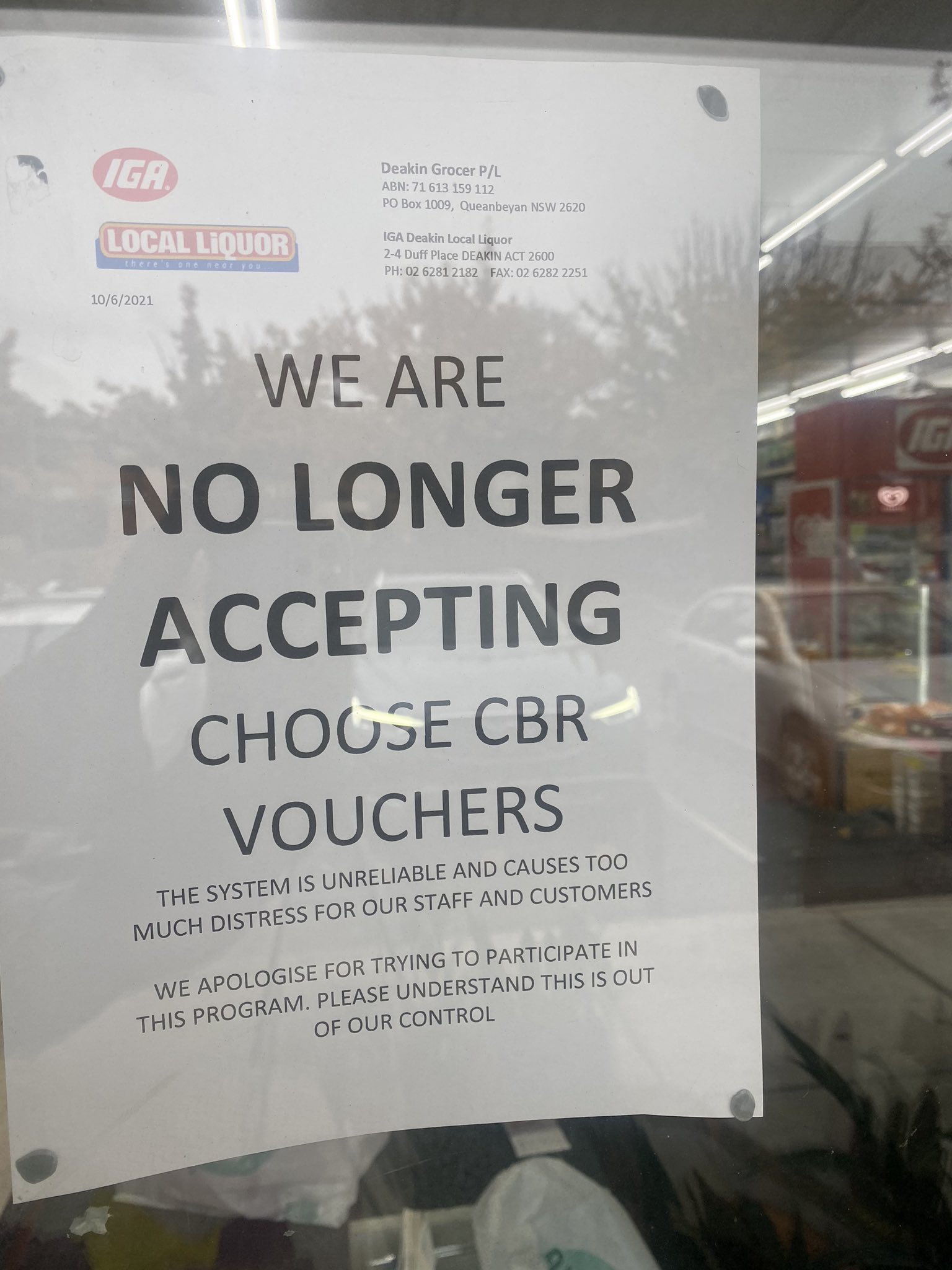 A sign posted in the window of the IGA in Deakin told customers the business would no longer accept the vouchers.