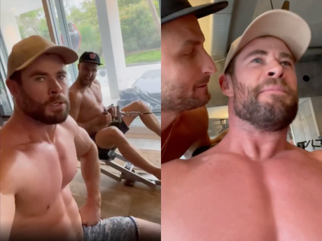 The clip shows him and DJ Fisher grunting throughout the video and shouting bizarre encouraging statements to each other to pump one another up. At one point, Hemsworth is hyping up his friend as he lifts weights outside.