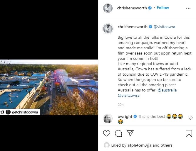 The actor used social media to accept the town's invitation after it launched an online campaign called 'Get Chris to Cowra' to help boost its profile.