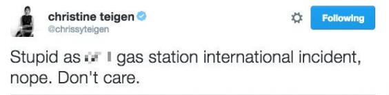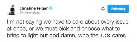 “I personally cannot bring myself to give two sh*ts about Ryan Lochte’s gas station fight and this is why,” Teigen wrote to her 2.4 million followers.