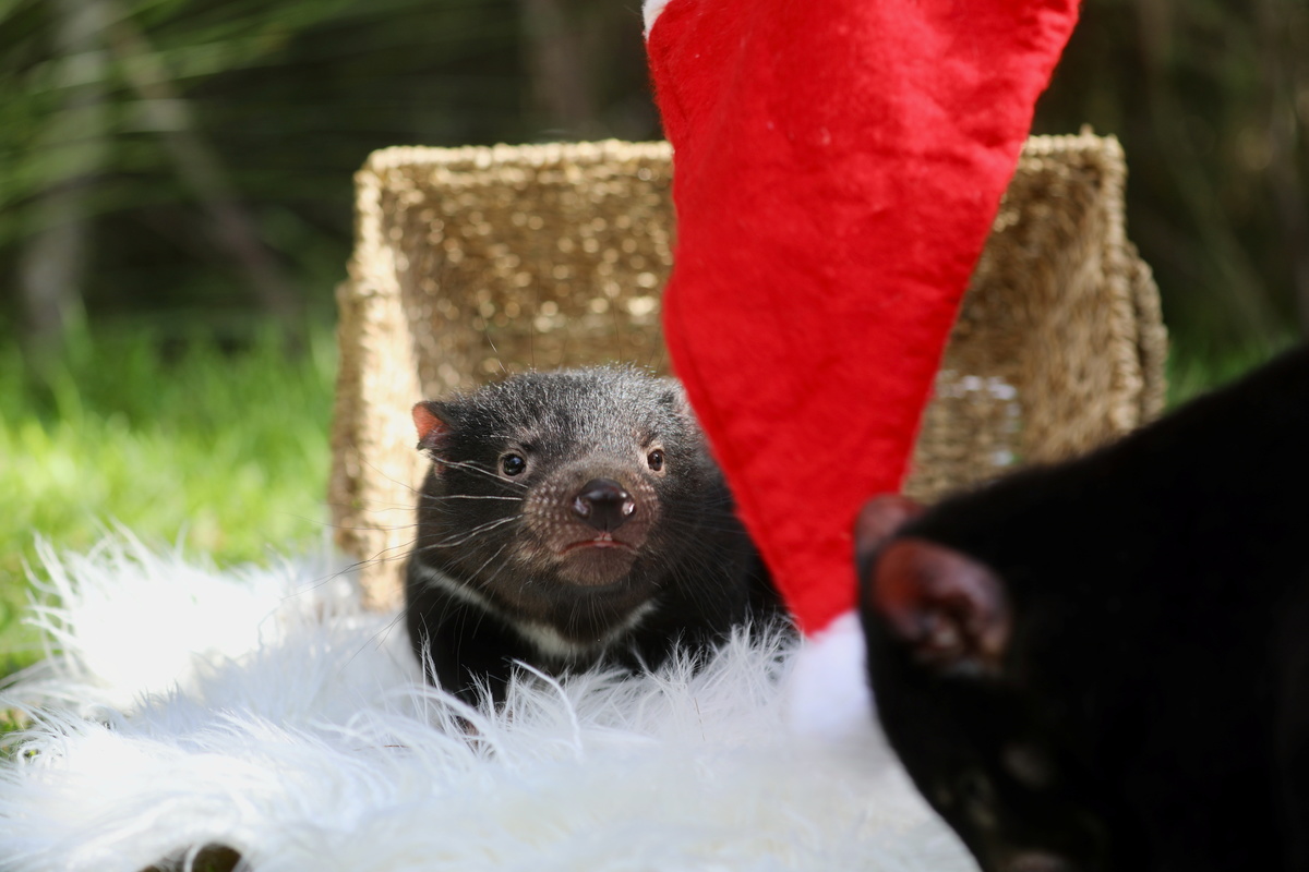 Two Tasmanian Devil joeys, Wolf and Alula, were seen in the footage biting at the bobble of a Santa hat, while Boobook owl chick Mango perched in a Christmas wreath.