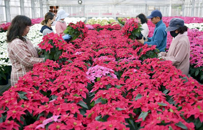 Employees at a garden center hold potted poinsettias in Kokubunji, Tokyo, on Friday as shipments of the seasonal plant reach their peak ahead of the Christmas season. Matsumoto Engei garden center has grown about 15 kinds of red, pink and white poinsettias, which have been planted in about 13,000 pots.