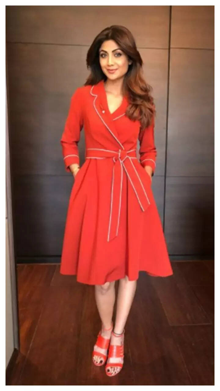 Shilpa gives a stylish definition to Santa colours of red and white in her vibrant trench dress.