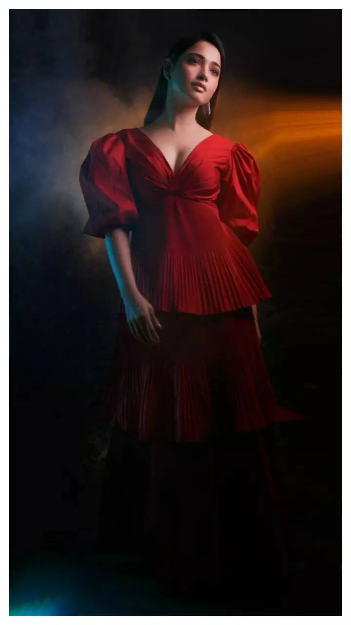 Tamannah Bhatia\'s puffed-sleeve outfit in red is a Christmas worthy look.