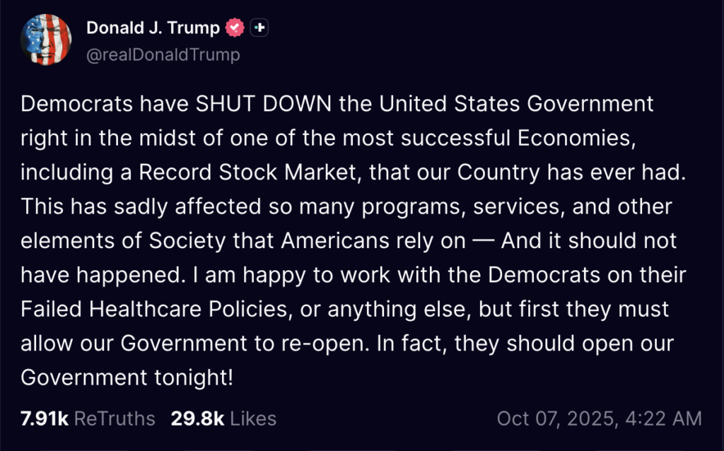 On Monday, Trump posted on Truth Social, blaming Democrats for the shutdown.