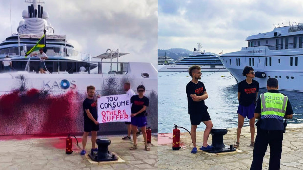 The vandals used fire extinguisher cans to shoot paint across the backside of the boat, according to the Spanish newspaper Periódico de Ibiza, before holding up a sign that read "You Consume Others Suffer."