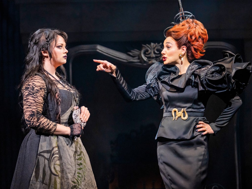 The problem, unfortunately, is that Cinderella herself is far less interesting than the world she looks at in disgust. Her scenes are an interesting contrast, often taking place in the shadowy woods she’s been banished to, but the songs she’s given are the weakest in the show, with rhymes you can hear coming a mile off. While Fletcher’s voice has never sounded stronger, the material makes it hard to want to stay in her world. When she’s with Sebastian, the pair have spells of great chemistry, but actual funny dialogue is undercut by random lines that sound like an AI writing how it thinks young people talk. Turco’s beautiful voice similarly feels wasted on ballad after ballad, with brief glimpses of something reminiscent of Judas in Jesus Christ Superstar leaving you wanting more.