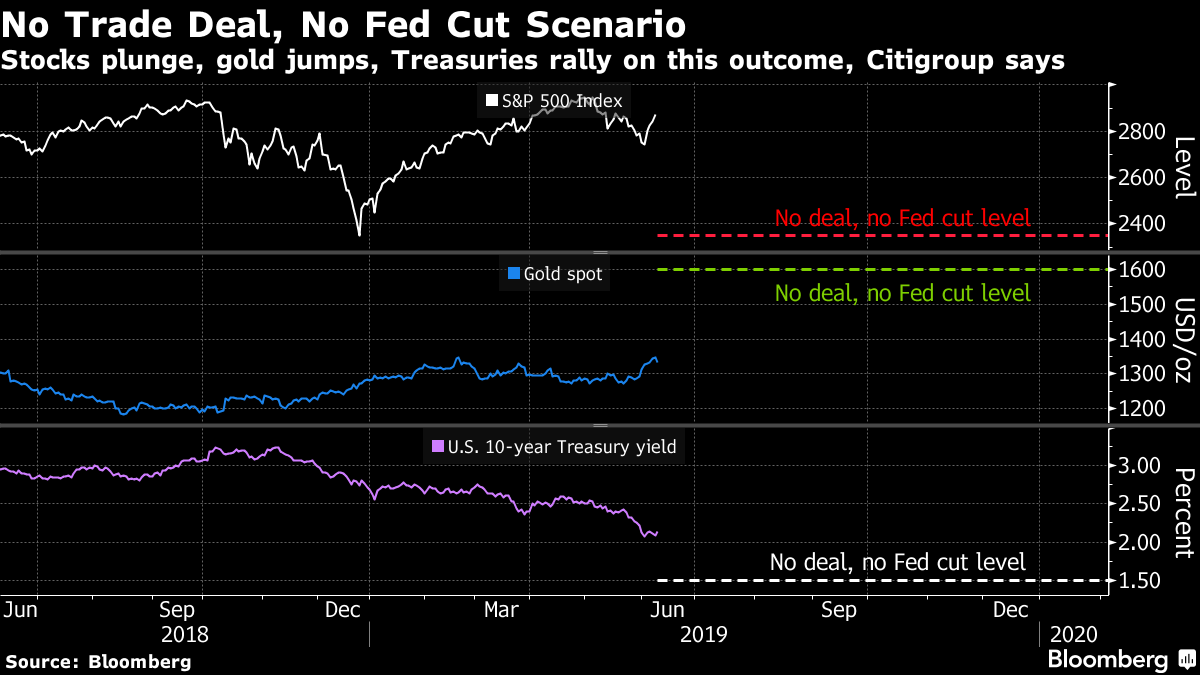 The good news is that the landscape “may be transitioning” to a different scenario, with no trade deal forthcoming with China, but the Fed providing 75 basis points worth of rate cuts. That would see new highs on the S&P 500, with 10-year yields as high as 2%. Gold would still gain thanks to a cheaper dollar, with a $1,500 target, the Citigroup team wrote.