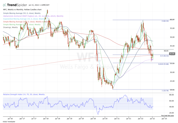 For a sustainable rally in Wells Fargo though, it has quite a few levels to clear. That begins with the 10-week moving average, which has been active support for months now.