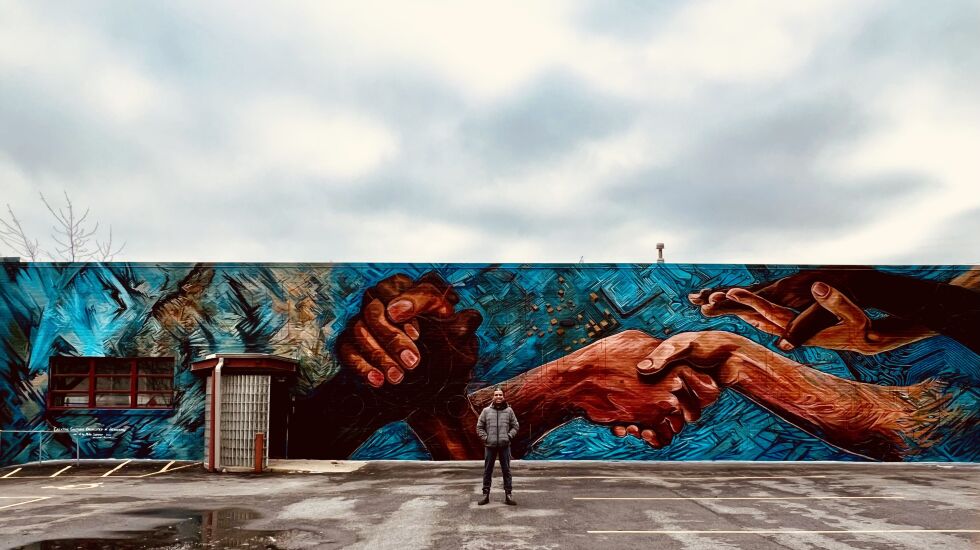 The main features of the mural, which covers a 100-foot-wide span, are three sets of hands. Each, Serrano says, is meant to represent a different type of human interaction. At left, two hands grip each other in an “expression of collective power and an embrace of solidarity,” Serrano says. In the center: a handshake, for a welcome greeting. The last pair of hands come together softly in a loving gesture, Serrano says.