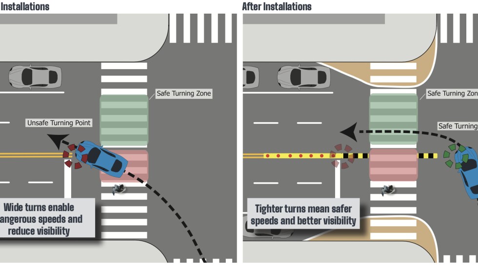 The idea is to force slower, 90-degree-angle turns and prevent drivers from making faster turns at a smaller angle that cut across oncoming traffic lanes. The ultimate goal is to better protect pedestrians in the crosswalk, who often end up in drivers’ blind spots on those left turns.