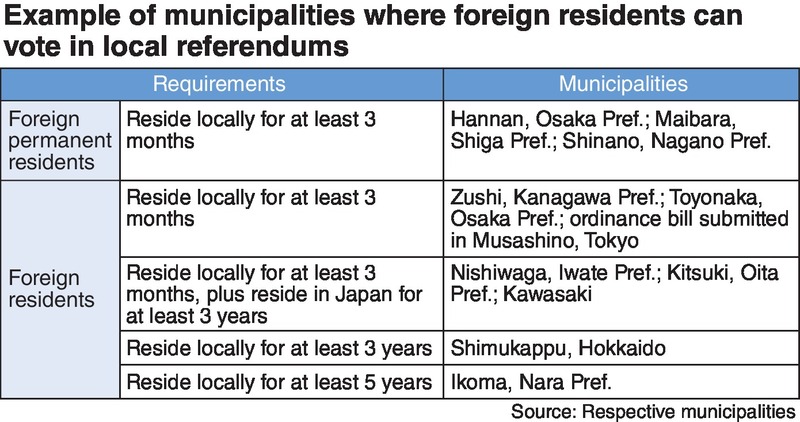 According to the Musashino city government, as of last December, permanent referendum systems were already in place in 78 municipalities. Of them, as many as 43 include foreign residents among those qualified to vote. The ordinances set varying conditions, such as granting voting rights only to foreign permanent residents. Only two municipalities -- Toyonaka, Osaka Prefecture, and Zushi, Kanagawa Prefecture -- grant foreigners voting rights under the same conditions as Japanese citizens.
