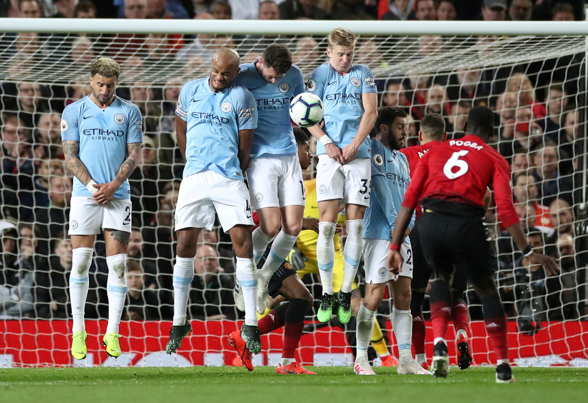 Soccer Football - Premier League - Manchester United v Manchester City - Old Trafford, Manchester, Britain - April 24, 2019 Manchester City's Vincent Kompany and team mates form a wall to defend a free kick taken by Manchester United's Paul Pogba. Action Images via Reuters/Carl Recine