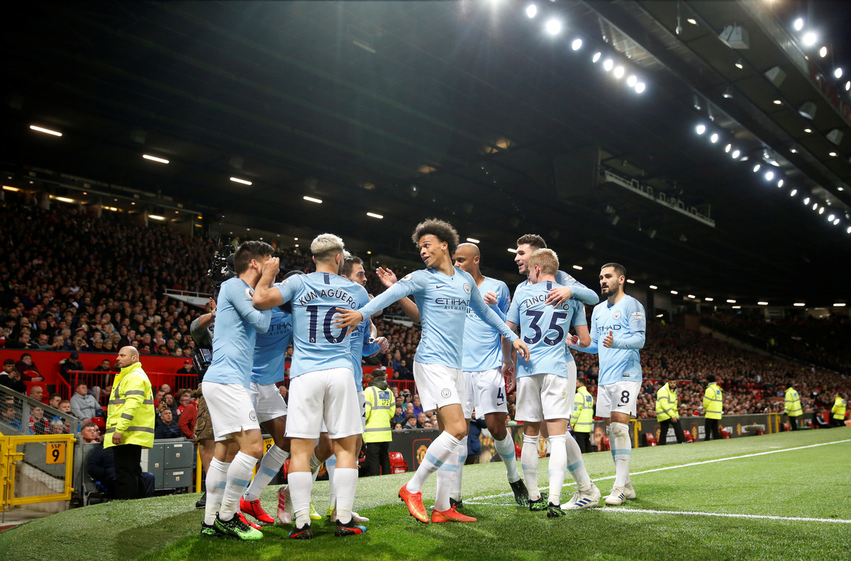 Soccer Football - Premier League - Manchester United v Manchester City - Old Trafford, Manchester, Britain - April 24, 2019 Manchester City's Leroy Sane celebrates scoring their second goal with Bernardo Silva and team mates Action Images via Reuters/Carl Recine