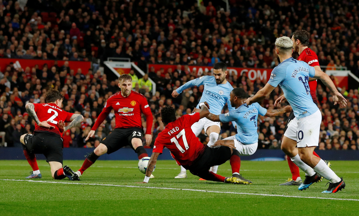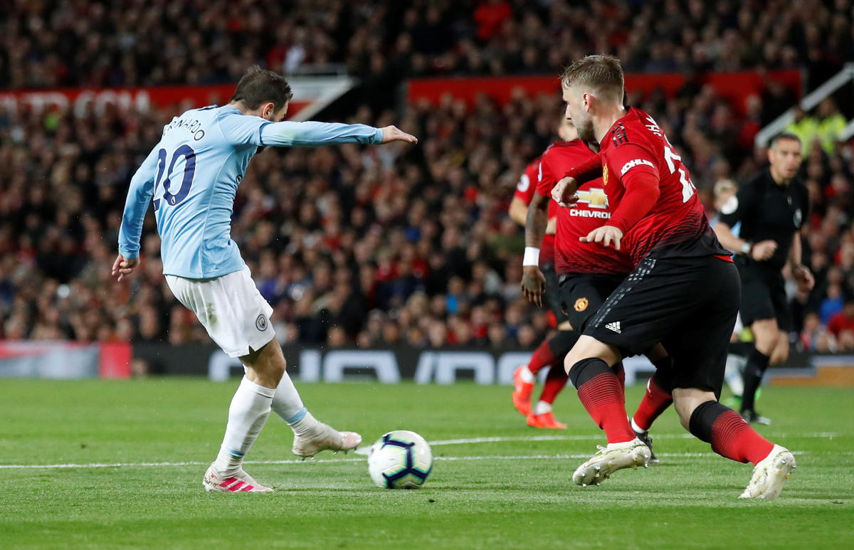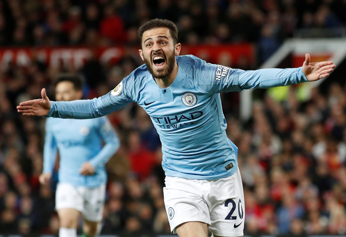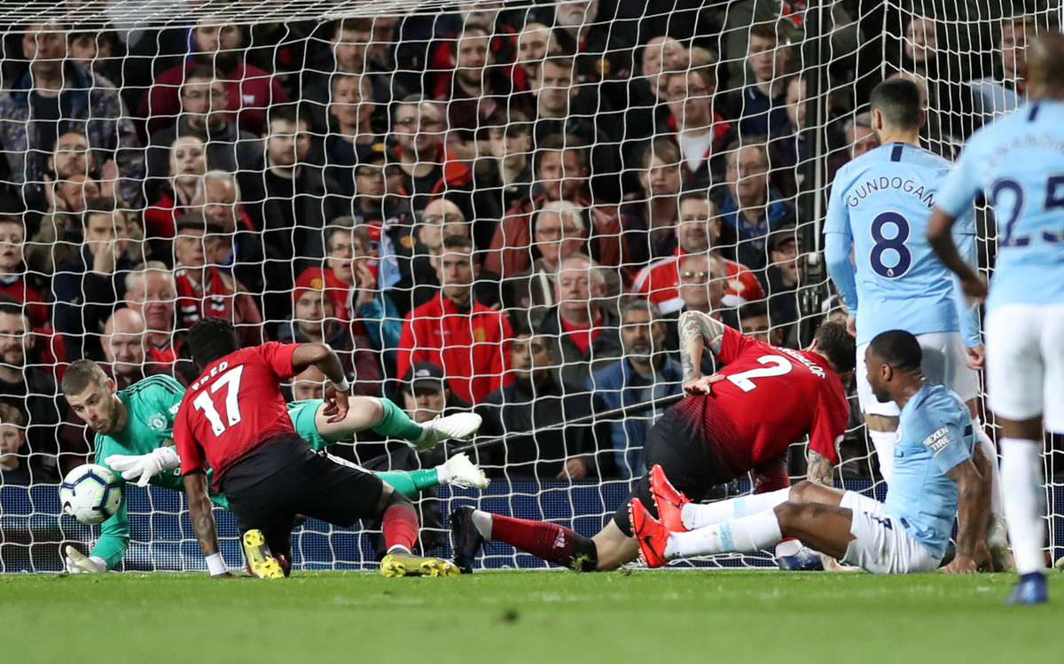 Soccer Football - Premier League - Manchester United v Manchester City - Old Trafford, Manchester, Britain - April 24, 2019 Manchester City's Bernardo Silva scores their first goal Action Images via Reuters/Carl RecineSoccer Football - Premier League - Manchester United v Manchester City - Old Trafford, Manchester, Britain - April 24, 2019 Manchester United's David de Gea saves a shot from Manchester City's Raheem Sterling Action Images via Reuters/Carl RecineSoccer Football - Premier League - Manchester United v Manchester City - Old Trafford, Manchester, Britain - April 24, 2019 Manchester City's Raheem Sterling shoots at goal REUTERS/Phil Noble.Soccer Football - Premier League - Manchester United v Manchester City - Old Trafford, Manchester, Britain - April 24, 2019 Manchester United's Paul Pogba in action REUTERS/Phil NobleSoccer Football - Premier League - Manchester United v Manchester City - Old Trafford, Manchester, Britain - April 24, 2019 Manchester United's Andreas Pereira is shown a yellow card by referee Andre Marriner REUTERS/Phil NobleSoccer Football - Premier League - Manchester United v Manchester City - Old Trafford, Manchester, Britain - April 24, 2019 Manchester City's Sergio Aguero in action with Manchester United's Fred and Victor Lindelof REUTERS/Phil NobleSoccer Football - Premier League - Manchester United v Manchester City - Old Trafford, Manchester, Britain - April 24, 2019 Manchester United's Paul Pogba in action with Manchester City's Fernandinho REUTERS/Phil Noble
