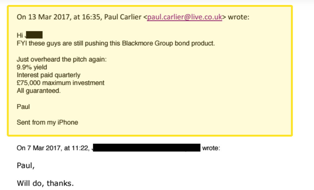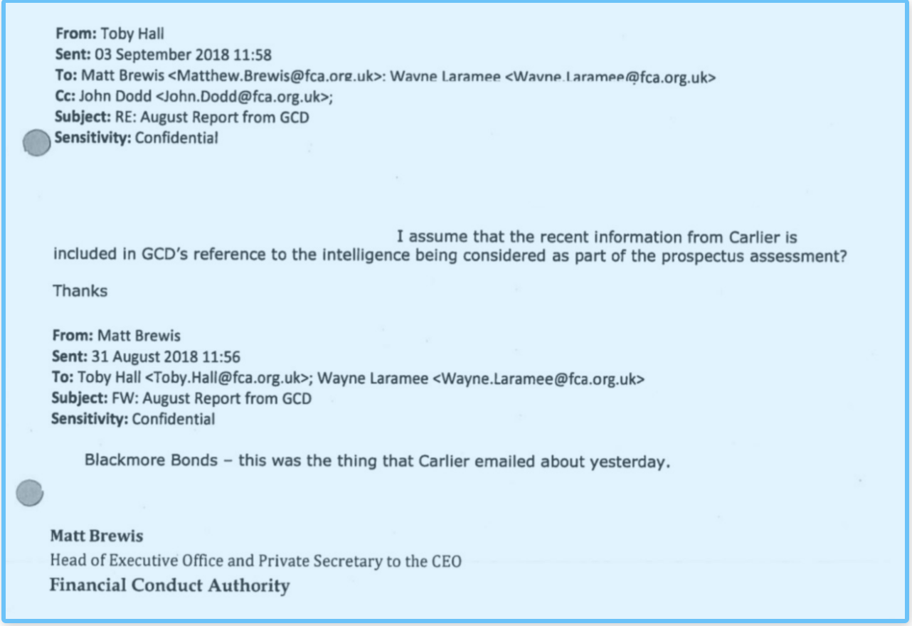 The day after Mr Carlier’s evidence, Mr Brewis emailed Mr Hall, stating: “Blackmore Bonds - this was the thing that Carlier emailed about yesterday.”