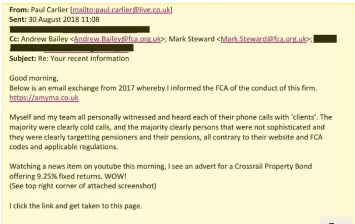 Paul Carlier, who has almost 30 years’ experience in financial services, wrote to the FCA’s whistleblowing team as far back as March 2017 to raise the alarm about a sales company called Amyma.