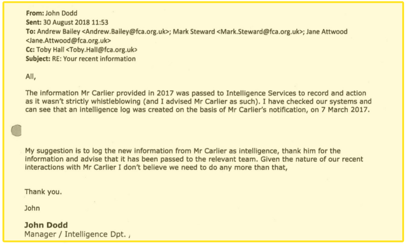 Half an hour later, a manager in the FCA’s intelligence team emailed Mr Bailey and Mr Steward stating: “My suggestion is to log the new information from Mr Carlier as intelligence, thank him for the information and advise that it has been passed to the relevant team. Given the nature of our recent interactions with Mr Carlier I don't believe we need to do any more than that.”