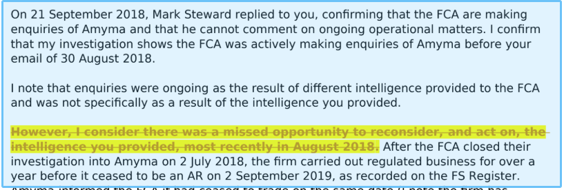 Mr Steward wrote back to Mr Carlier saying that he was “making enquiries”. However, the FCA did not contact Mr Carlier for more information or visit the office where the alleged illegal activity took place. Despite the allegations of misconduct, the FCA authorised Amyma in July 2018, meaning it could legally market financial products to consumers.