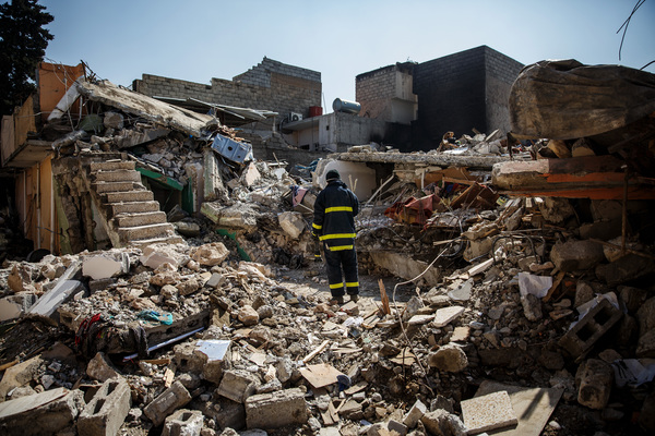 In the western neighborhood of Mahata, numerous buildings appeared to have been bombed, their roofs collapsed and spilling into streets still choked with burned cars and other debris.