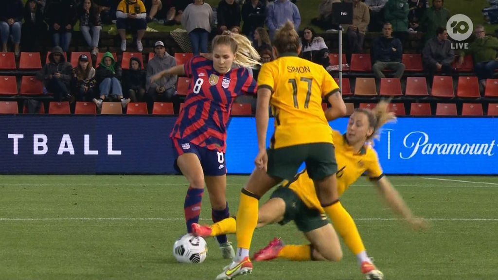 Following the tackle, Wheeler fed the ball to an exhausted Steph Catley, who clipped a cross in for Sam Kerr to control and lay off for the coiling Kyah Simon. Simon, seething at having missed a sitter in the first friendly on Saturday, lashed at the ball, which deflected off the leg of USA defender Becky Sauerbrunn and flew into the back of the net.