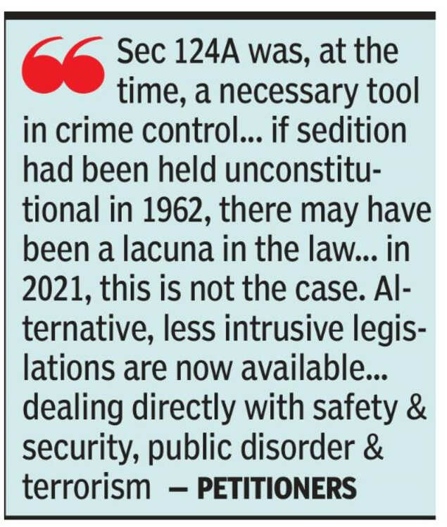 "Section 124A, was, at the time a necessary tool in crime control. It is conceivable that if sedition had been held unconstitutional in 1962, there may have been a lacuna in the law, the mischief — public disorder and violence — going unpunished. Contrastingly, in 2021, this is not the case. Alternative, less intrusive legislations are now available. The last nearly sixty years have seen extensive enactment of new legislations dealing directly with safety and security, public disorder and terrorism. Prominent among these are the Unlawful Activities (Prevention) Act, Public Safety Act and the National Security Act. Various sections of these Acts deal directly with the overt conduct that sedition seeks to make penal — inciting violence and public disorder," the petition said.