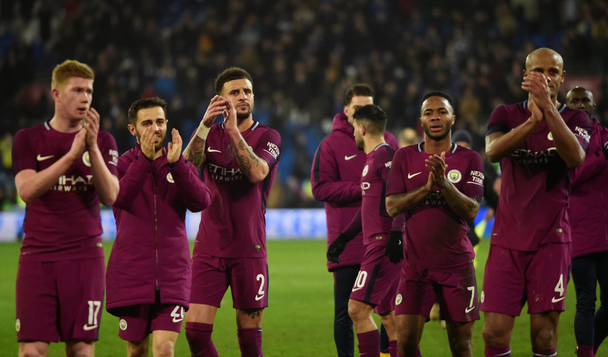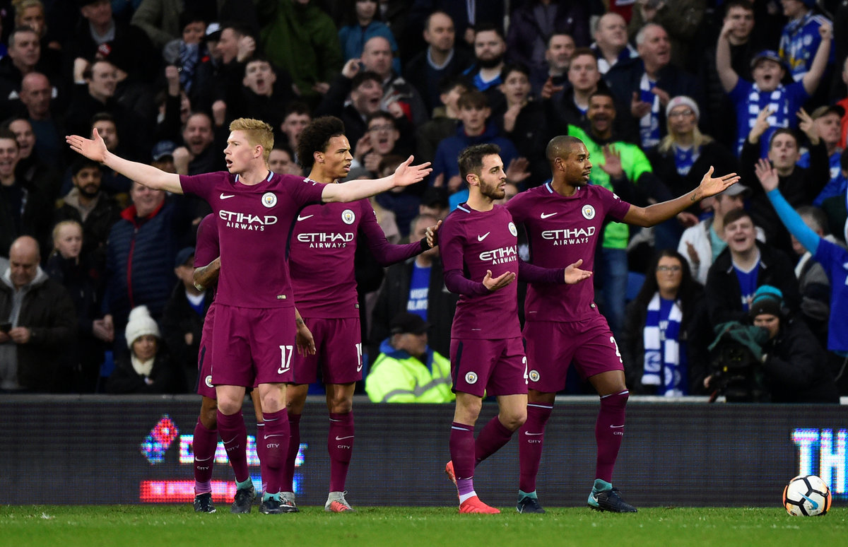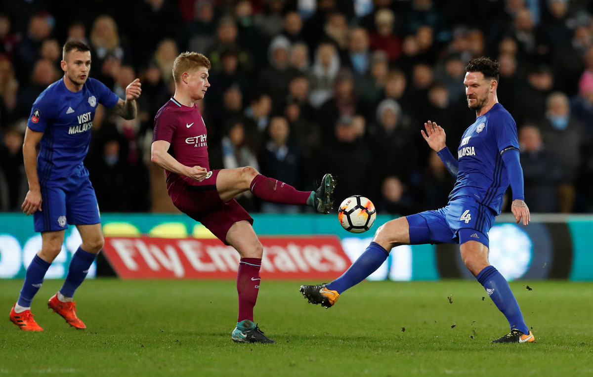 (Reuters) - Manchester City swept aside second-tier Cardiff City 2-0 with first-half goals from Kevin De Bruyne and Raheem Sterling on Sunday to reach the FA Cup fifth round in their quest to win an unprecedented four trophies this season.