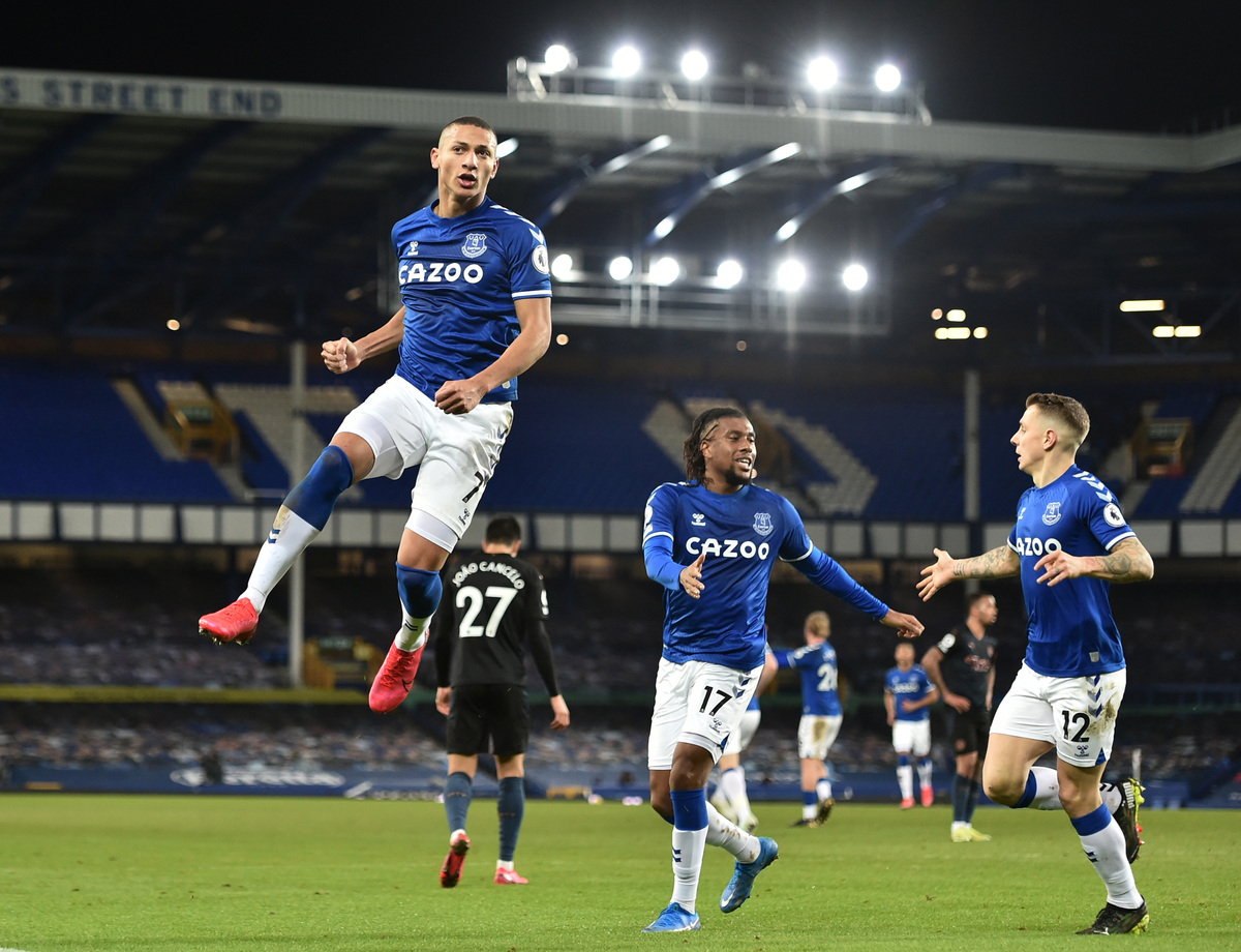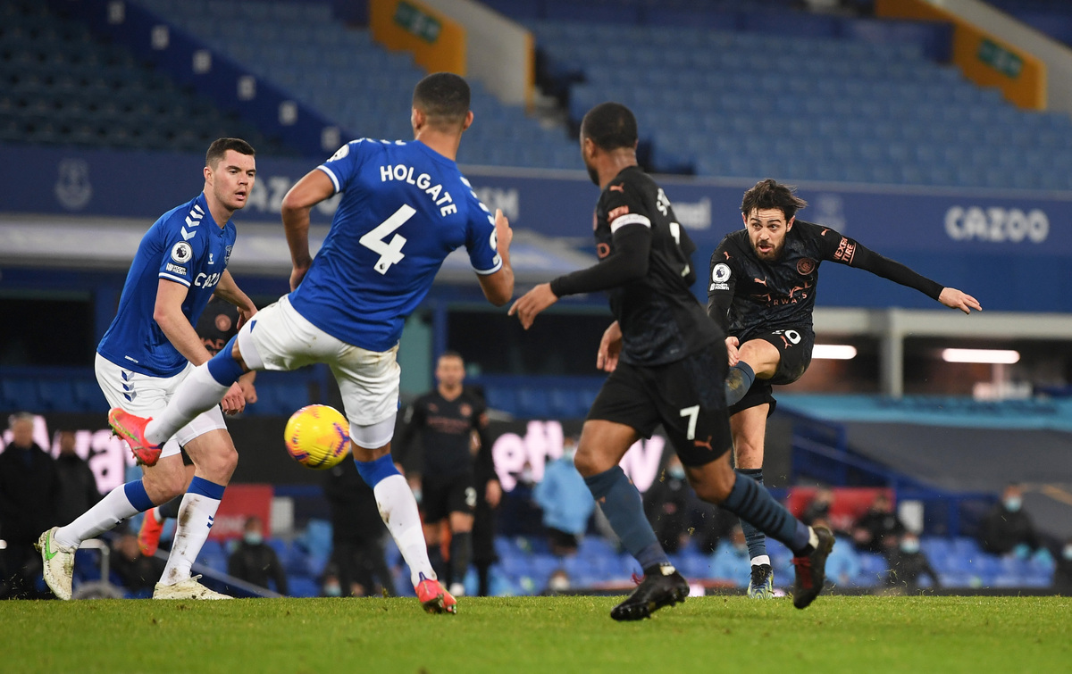 A deflected, but sweetly struck, shot from Phil Foden put City ahead at Goodison Park in the 32nd minute but Everton struck back quickly when Lucas Digne's shot hit the post and was turned in by Richarlison.